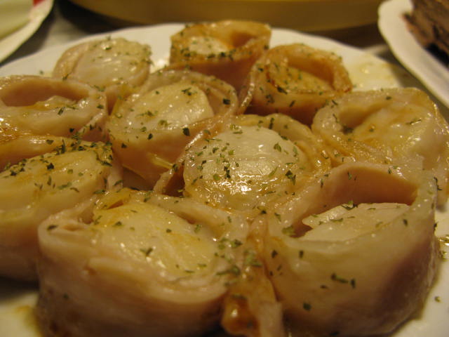 ホタテのベーコン巻き。お刺身用ホタテに半分の幅にスライスしたベーコンをくるくると巻き、折ったスパゲッティでとめます。