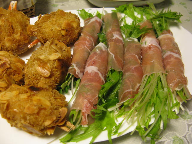水菜・アスパラガス・貝割れ大根を生ハムでくるんでいます。簡単なので、パーティーの付け合わせ用に時々作ります。
