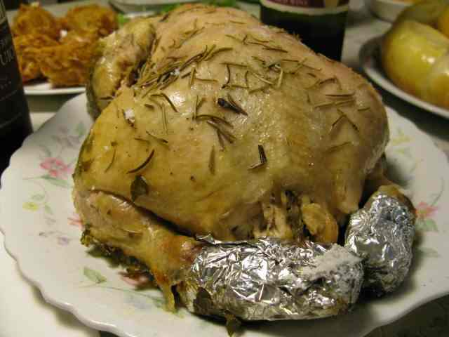 丸鶏の中にはきざんだ野菜を炒めたものが入り、表面は塩こしょうやハーブを塗っています。