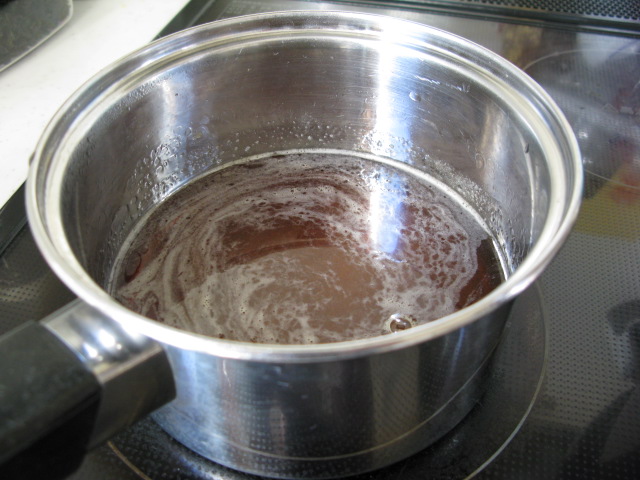 ザラメを1と1/2カップ、水を1/2カップ小鍋に入れて、ザラメがとけたら塩をひとつまみ入れておきます。