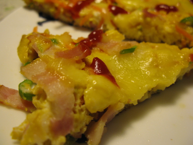 スーパー適当料理。卵6個に、にんじん、ピーマンのスライス、ベーコン、生クリーム、塩こしょうを入れて、バターを入れたフライパンで焼きます。