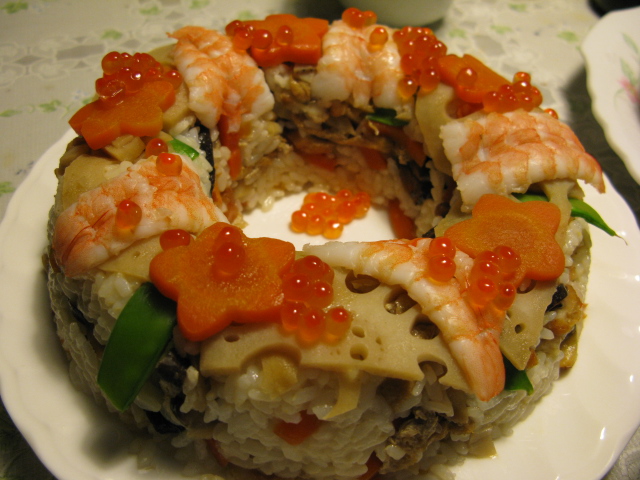 作り方は例年と一緒ですが、今年は、丸いケーキ型にしてみました。ラップをしいて、えびやニンジンをしいてから、ちらし寿司を詰め込みます。