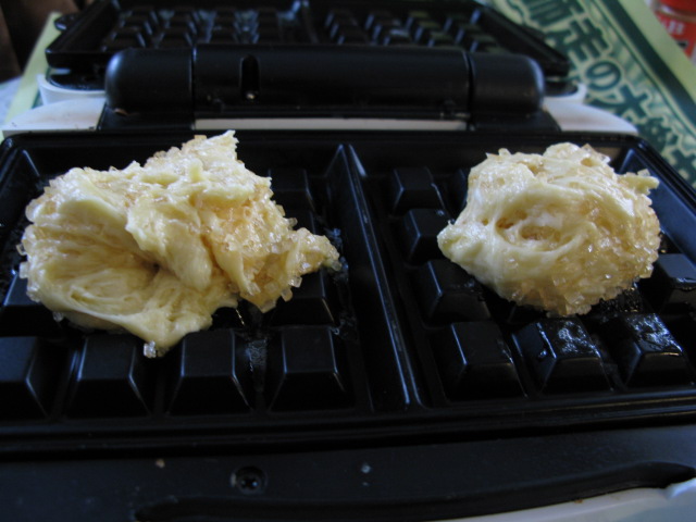 ワッフルメーカーに、少しずつちぎって入れ、はさんで5分ほど焼いたらできあがりです。