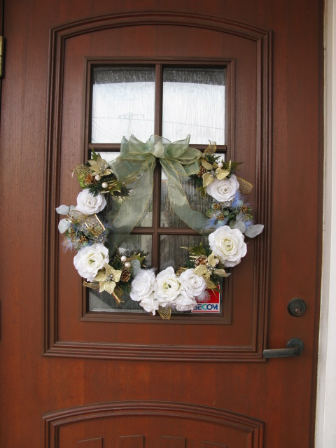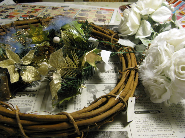 材料を並べたところ。ジョイフル本田で、一番大きいサイズのリースでした。白と青を基調とした色合いにしてみました。