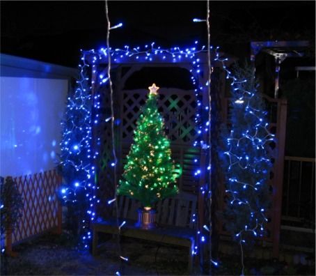 パーゴラにブルーのLEDを飾り、ベンチの上にファイバーツリーを飾るのは例年どおりです。