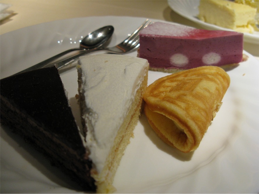 手続きし、乗船すると、テーブルに案内されます。メニューによってフロアが分かれているらしく、バイキングは3階でした。出航する前からケーキを取り、飲食可能。