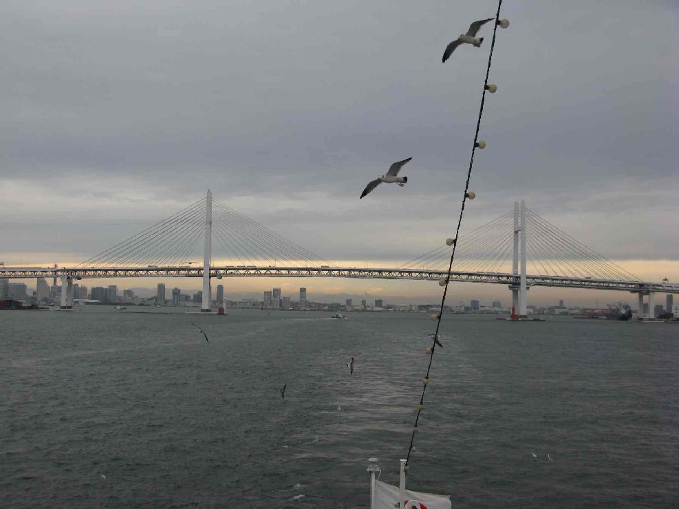 ひととおり食べて、お腹いっぱいになり、サンデッキに出ました。ベイブリッジ、みなとみらいが見えて、景色が良い。かもめが船の周りにたくさん飛んでいます(鳥のえさを持って行くと楽しいのかも知れません)。