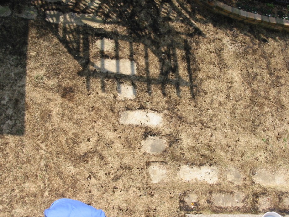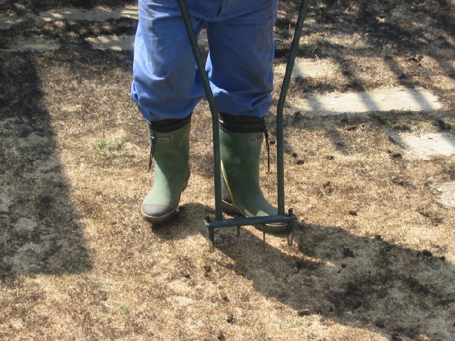 芝生の手入れ。家庭版火炎放射器で芝生を焼いた後、穴を開けていきます。