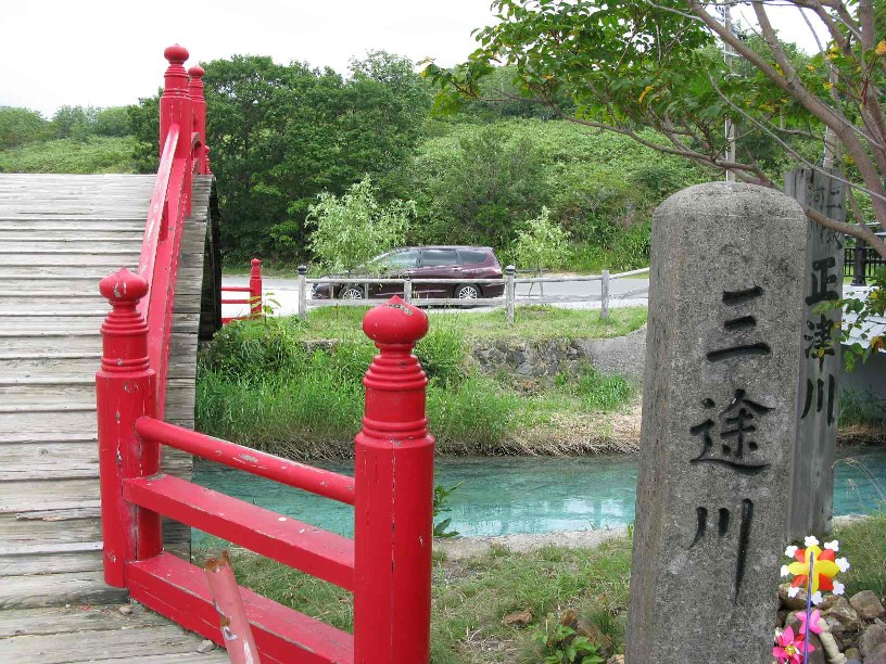 昔話に出てくるような半円形の橋がかかっているのですが、川の色が、瑠璃色というか・・・、不思議な蒼い色をしています。
