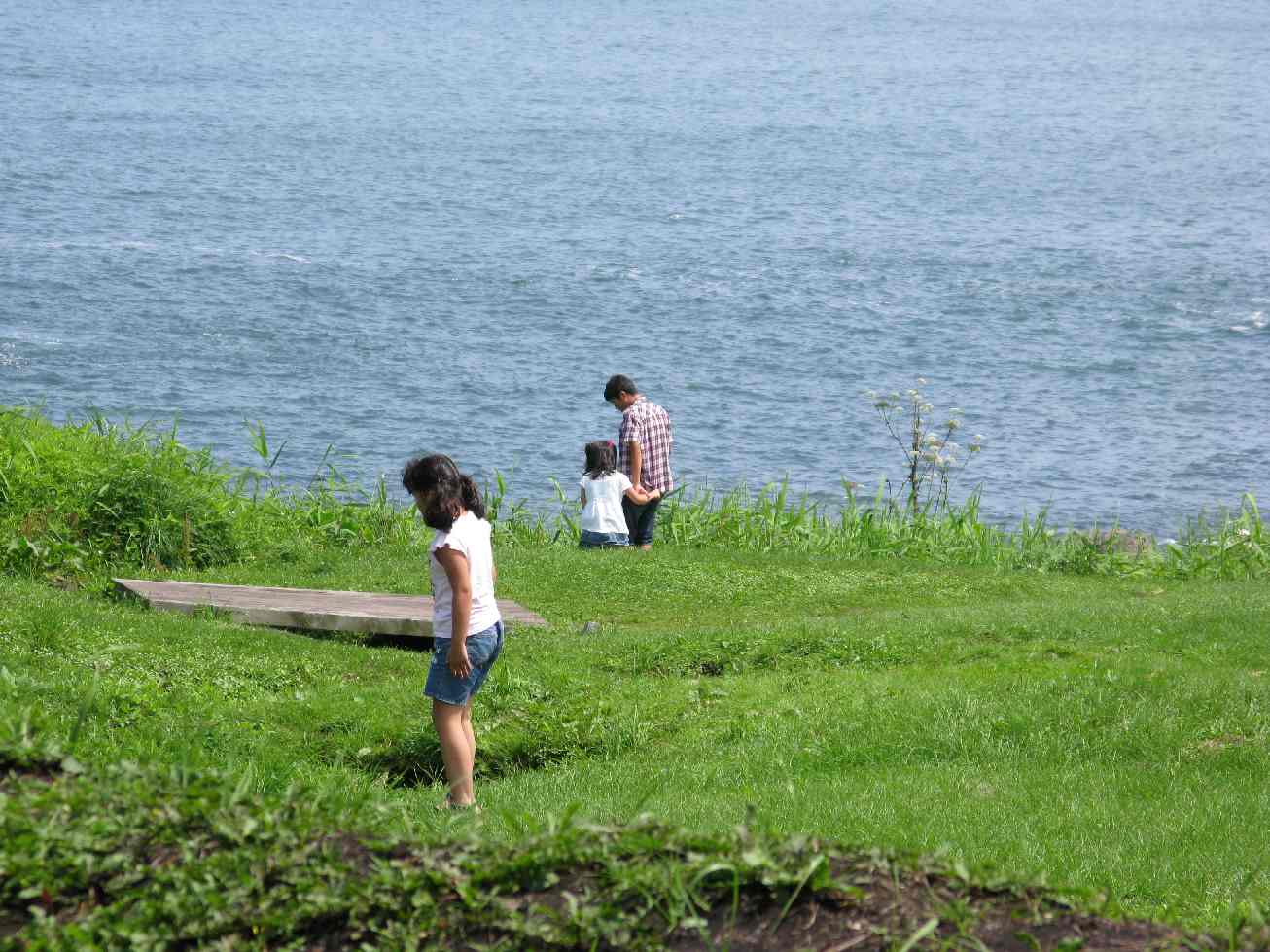 芝生の海岸として有名らしい。海に流れ込む小川があり、子ども達は葉っぱの舟を流して追跡、という遊びに熱中。