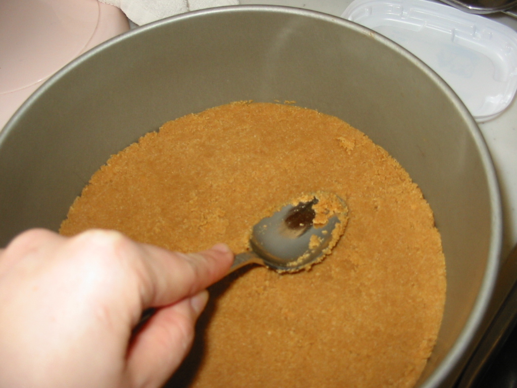 3.バターをレンジで溶かして、マリービスケットと混ぜ合わせ、ケーキ型の底に敷き詰めます。オーブン180度で10分焼きます。