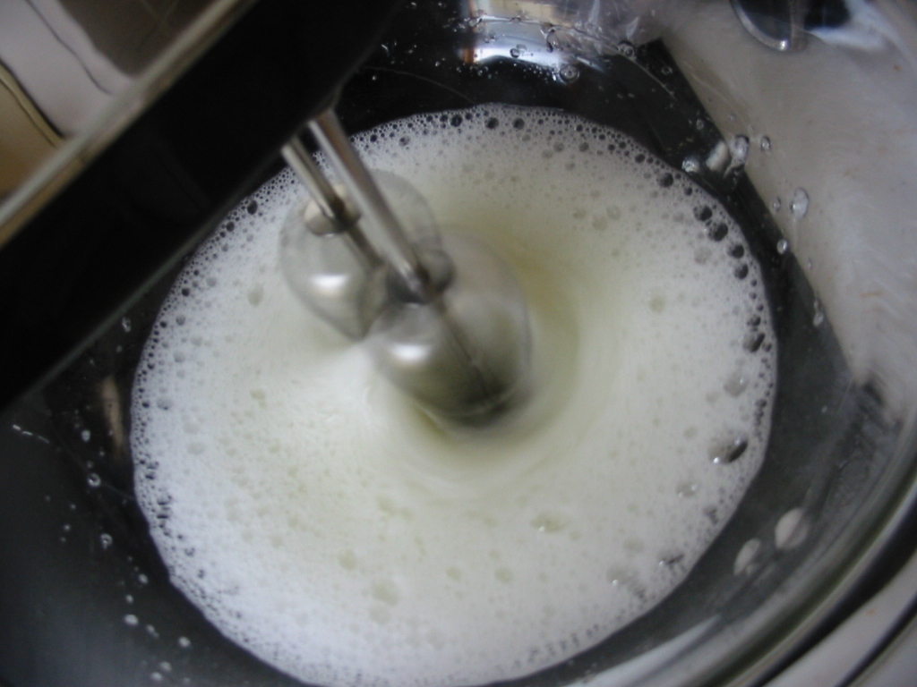 7.卵白に砂糖を加えて、固く角が立つまで泡立てます。