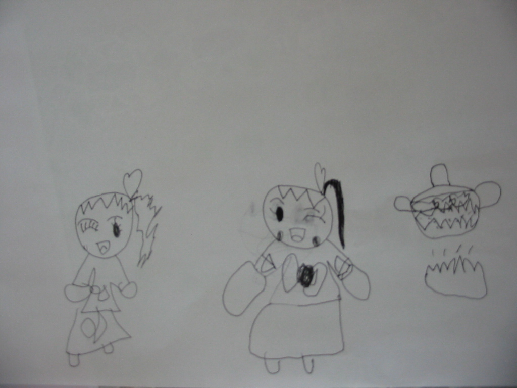 マナ(4歳)の絵。常に、片目をばっちりつぶってウィンクしているという特徴があります。右側は、火にかけている鍋でしょうか。