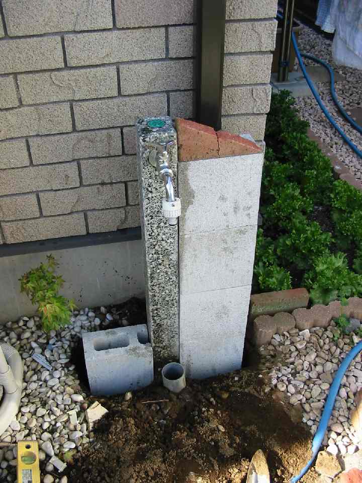 もともとの水道の根元を掘って平らにしておき、そこにブロックを積んでいきます。