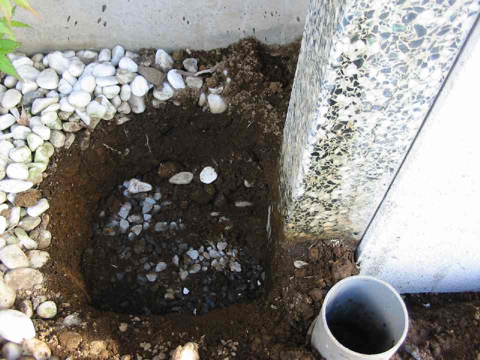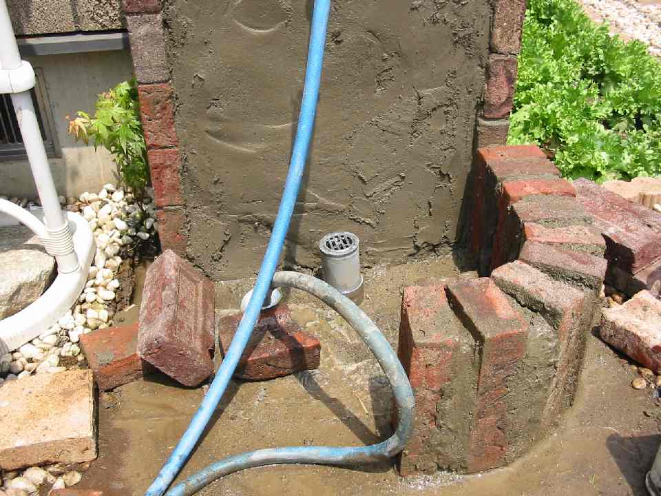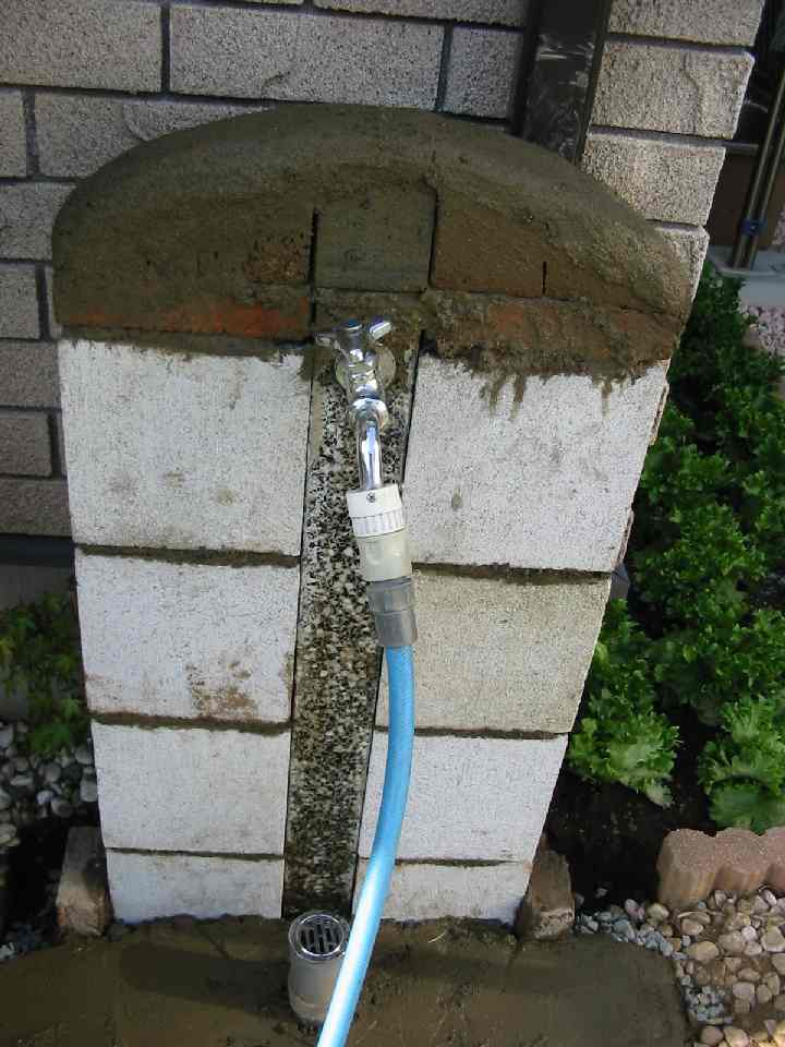 もともとの水道部分。何しろ素人作成ですから、無謀なことに、もともとの水道はそのままにして、両脇にブロックを積み上げ、全体にモルタルを塗りたくるという作戦に出ました。