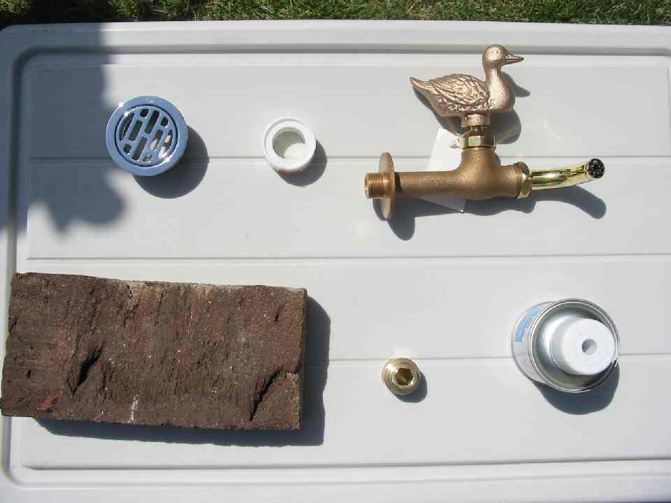準備したもの。レンガ、新しい水栓金具。砂、セメント。衣装ケース。コーティング用のモルタル。