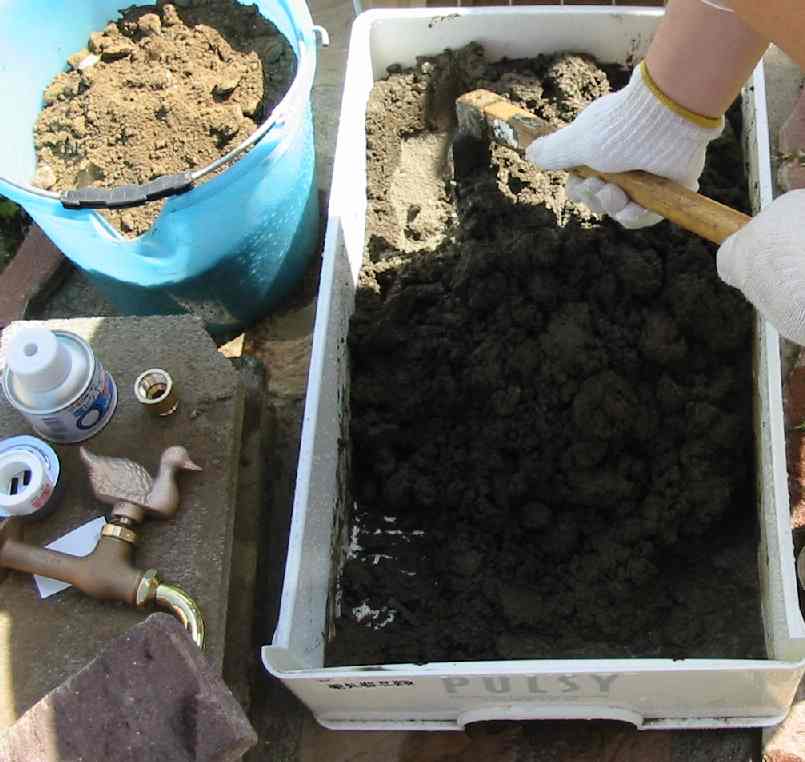 モルタルを作ります。砂とセメントを3対1でこね、水を加えてもったりとするまで混ぜ続けます。腰に来る作業です。専用のケースを買うのがもったいないので、不要な衣装ケースを使っています。