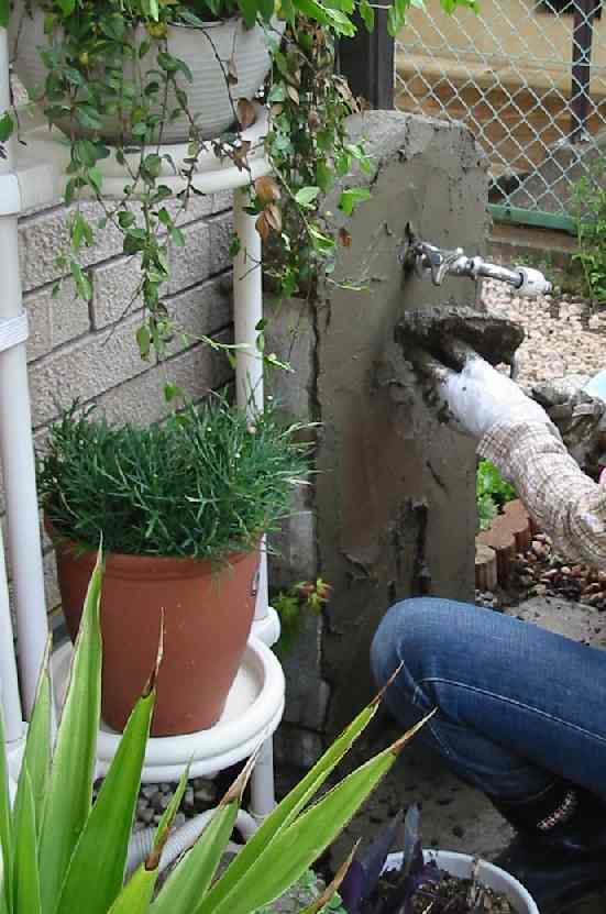 庭の立水栓は、コストを抑える関係で、超無機質な水栓でした。これを、自作でリニューアル。今回も製作担当者はワタシ(妻)でした。夫は、モルタル作りを手伝ってくれました。