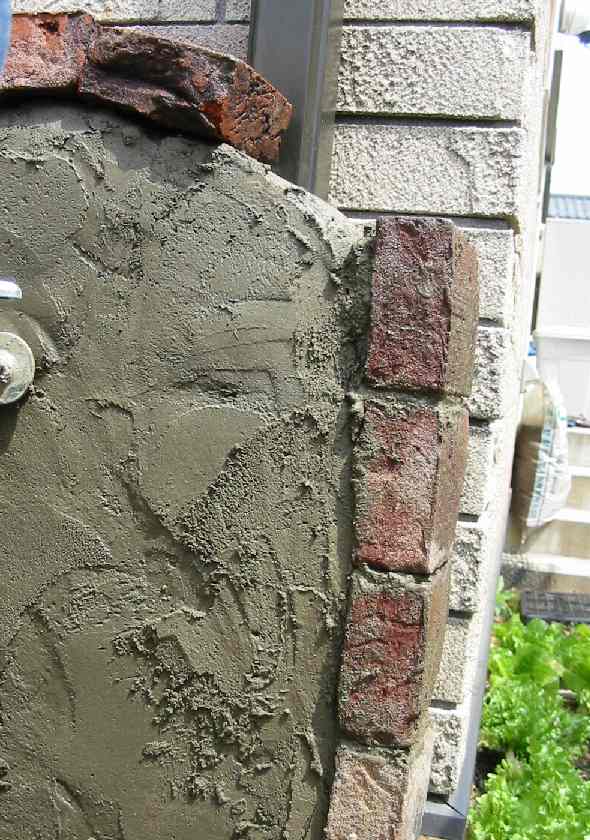 水受けになる部分には、1枚のレンガを縦においてモルタルを詰めていきます。この頃になると、かなり疲れておりまして、Rの形がすごくいい加減になってしまいました(反省)。