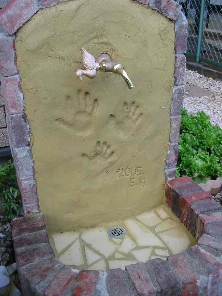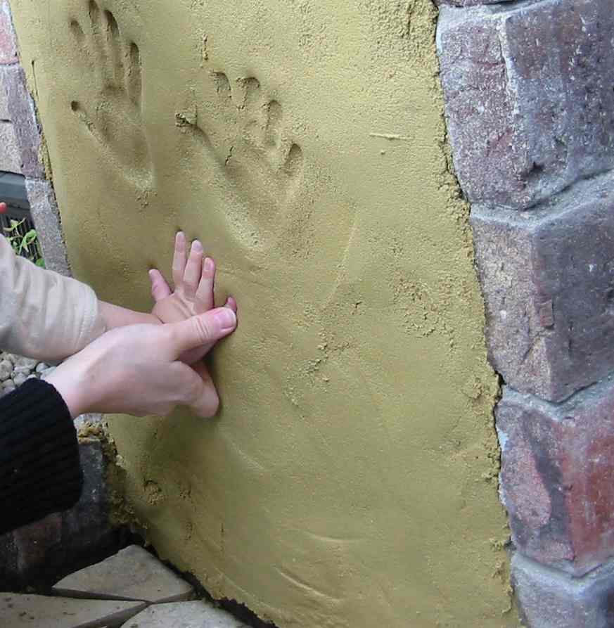 記念に、3人のお子達の手形を押しました。前面部には、色のついたモルタルを塗り重ねています。