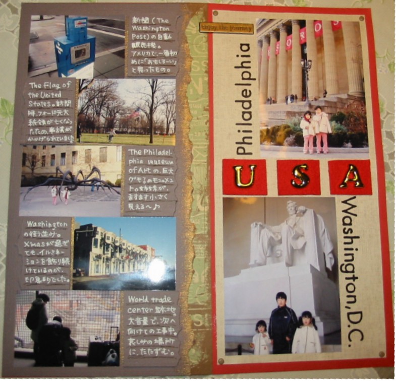 スクラップブッキングをまた作りました。1年ほど前にアメリカに行ったときのもの。夫が単身赴任だったため会いに行ったのですが、むちゃくちゃ大変でした。