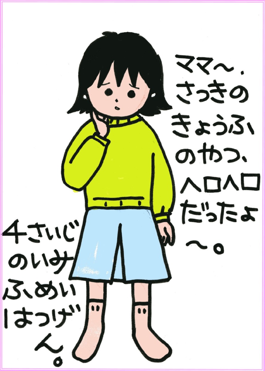 ↑ 朝の発言。「さっきのきょうふのやつ」自体がワタシには分からん。でもこんなときには「きょうふのやつって何?」なんていわずに「え~、そうなんだ、やばいねえ」と答えます(笑)。