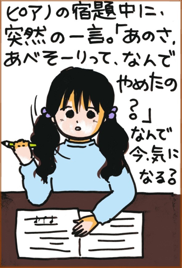 午後にあるピアノの宿題(♪を書く練習)をやっていなかったので、慌てて午前中にやっていたヒメ(小1)。突然顔を上げて「あのさ、あべそーりって、なんでやめたの?」と言い出しました。