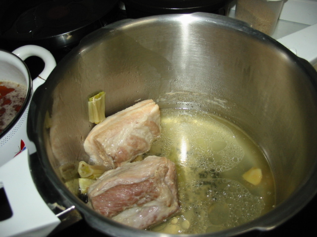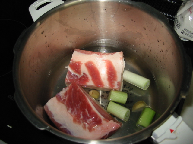 1.活力鍋に、塊肉(大きければ半分にカット)、水1カップ、日本酒1/2カップ、長ネギとしょうがを入れてふたをし、高圧におもりをセットします。