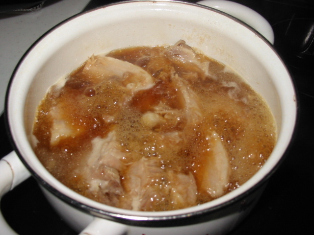 4.別の鍋に、水1カップ、日本酒1/2カップ、みりん、しょうゆ、中ザラメ糖を入れて、3の肉を入れてぐつぐつ煮ます。