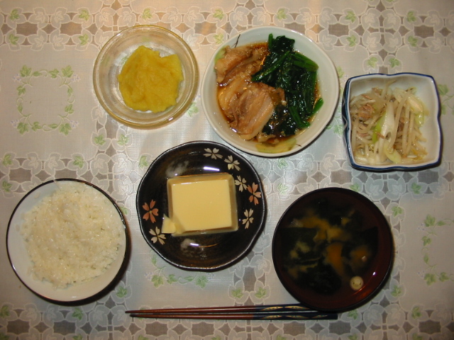 豚の角煮・もやしとツナの中華炒め・卵豆腐・栗きんとん・わかめの味噌汁・ごはん。