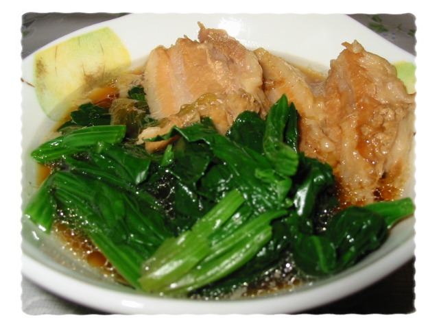 5.茹でたほうれん草や青梗菜などを添えて、出来上がり。