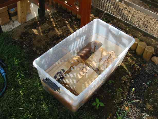 レンガは、水につけておきます。水につけないと、レンガがモルタルの水分を吸ってうまく接着しないらしいです。泡が上がってくるのですが、それが出なくなるまで。