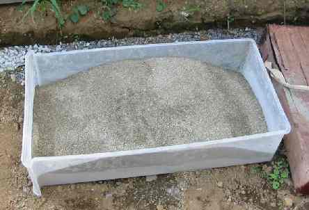 モルタル作り。砂とセメントをブレンドします。砂3:セメント1だったかと思います。専用の箱を買うのはもったいないので、不要な衣装ケースを使いました。砂とセメントをシャベルなどでよくブレンドします。そこに、水を入れて、もったりとした感じになるまで混ぜ続けます。水を入れると、衣装ケースは重量オーバーな感じになりますが、耐えてくれます。当然ながら、作った分はその日に使い切らなければなりません。