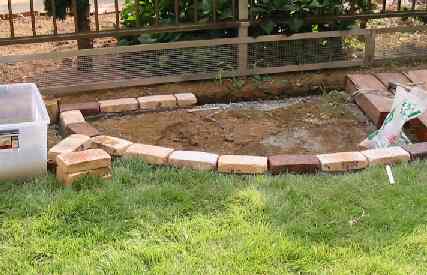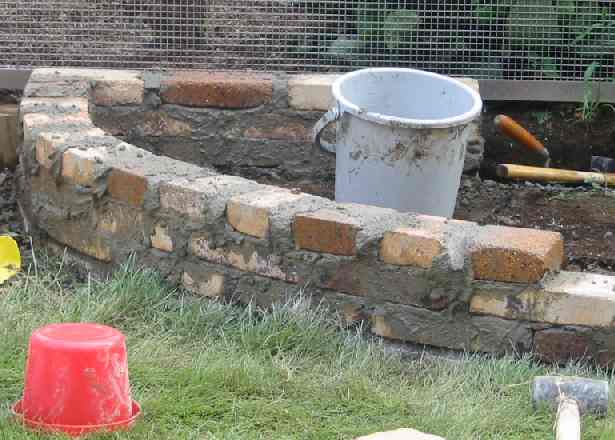 製作中。こんな普通の格好でやっとります。モルタル作り、レンガ積みの時のこの姿勢は本当に腰に来ますが、出来たときの喜びはひとしおです。