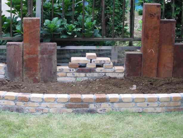 花壇は、レンガだけではなく、枕木を使いました。ばらばらの枕木の裏面を金具で止めてあります。中心部は、レンガがあまったので積み上げてみました。