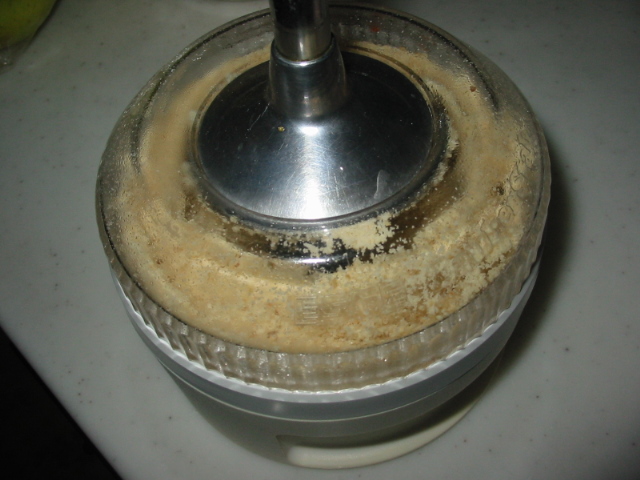 3.しばらくすると、ピーナツがグラインダーの羽にからまない「空回り」状態になります。こうなったら、バーミックスを外してふたを開け、スプーンなどで周囲のピーナッツを中心部に落としていきます。