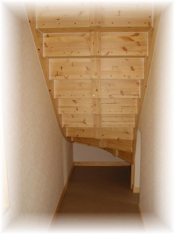 階段の裏側です。階段の裏側の補強をするかどうかと内装の大工さんに聞かれ、補強してもらったとのことです(夫談)。この裏側スペースはどうなっているかというと、母の部屋のウォークインクロゼットの一部になっています。階段裏側の奥底まで、荷物が収納できるようになっています。