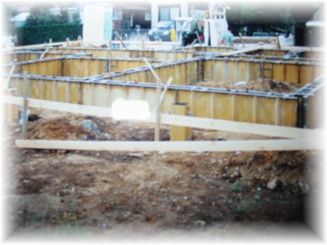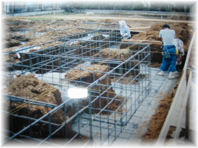 基礎は、F1布基礎というものです。基礎専門、水道など配管専門の業者さんがもくもくと作業します。水道の配管業者さんが、ご夫婦で作業をしていて、ある日お子さん達を連れてきていたのが印象的でした。人によっては、お子さん連れとは何事?と思うかも知れないのですが、私は、「家族で一緒に仕事なんていいなー!」と思いました。お子さん達もお手伝いしてくれていました。