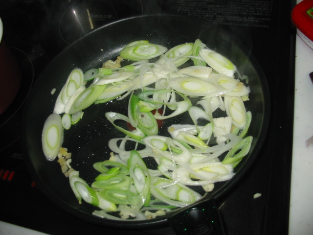1.サラダ油を熱して、しょうが・にんにくのみじん切りを炒め、香りが出たら長ネギを炒めます。