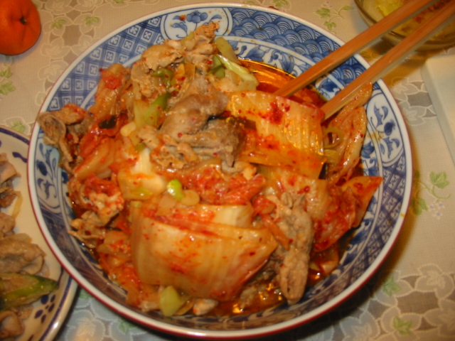 仕事から帰って6時15分。いつもどおり、座る間もなく夕食準備。今日のメニューは豚キム炒めです。キムチは母の漬けたものでございます。キムチはまだお子達が食べられないので、子ども用を途中で取り分けておきます。
