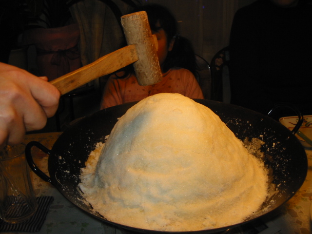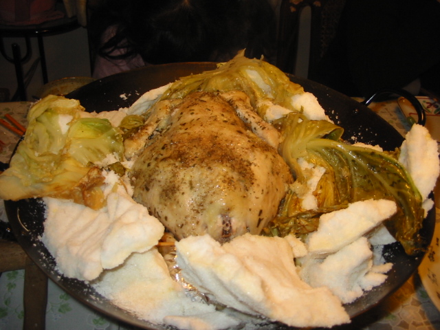 大まかに言うと、丸鶏の中に野菜やパンなどを炒めたものを詰め、外側にはにんにくやハーブ、オリーブオイルなどを塗ります。それをキャベツの葉でくるみます。大きな中華なべに、塩に卵白を混ぜたものを敷き、丸鶏をおいて、さらに全体を覆うように卵白塩で固めます。